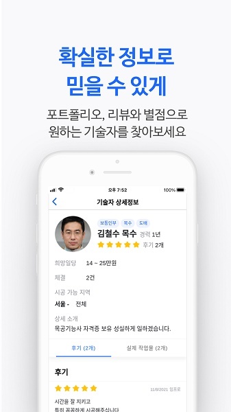 업체 측에 따르면 해당 플랫폼에는 본인인증, 경력인증 시스템이 도입됐으며, 몇 번의 터치만으로 구직자가 자신의 포트폴리오를 완성할 수 있다. 아울러 객관적인 정보로 기술자를 매칭할 수 있도록 투명한 리뷰시스템을 구축했다고 업체 측은 설명했다.