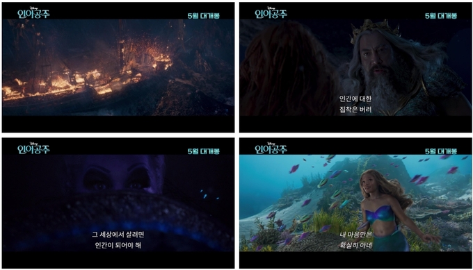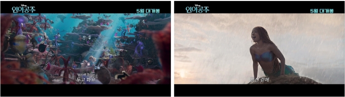 한편, “넌 규칙을 어기고 물 위로 갔어”라는 ‘트라이튼 왕’의 질책에 “더 알고 싶은 것뿐이에요”라고 대답하며 인간 세계를 동경하는 ‘에리얼’의 모습이 펼쳐지는가 하면 인간이 되길 원한 ‘에리얼’이 결국 다리를 얻고 바닷속 세상을 벗어나는 모습까지 엿볼 수 있어 ‘에리얼’이 내린 선택과 그 결과에 대한 궁금증을 더한다. 이어지는 ‘에리얼’이 바닷속을 자유롭게 헤엄치는 장면은 형형색색의 바닷속 풍경과 다양한 해양 생물들을 생생히 그려내 다채롭고 화려한 비주얼과 풍성한 볼거리를 예고한다.