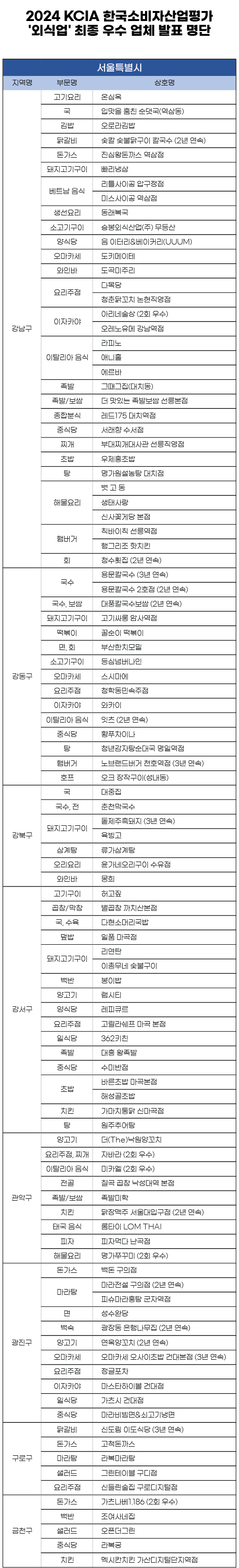 KCA한국소비자평가는 대한소비자협의회가 주최하고 한국소비자평가가 주관하는 ‘2024 KCIA 한국소비자산업평가 ‘외식업’’ 서울 일부 지역 (강남구, 강동구, 강북구, 강서구, 관악구, 광진구, 구로구, 금천구) 평가 결과를 발표했다고 5일 밝혔다.
