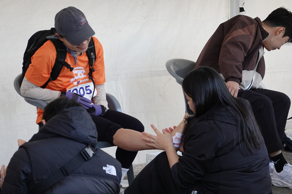 테이핑 전후 긍정적 피드백을 주는 사람도 많다고. 신준호 팀장은 “사실은 테이핑을 안 해보신 분들도 굉장히 많은데, 이런 대회에서 테이핑을 받아보고 뛰어보니 훨씬 통증이 줄었다는 피드백도 많다”고 말했다. 조 팀장도 “얼마 전까지만 해도 테이핑 부스의 수요가 이렇게 많지 않았는데 최근에는 참가자들의 반응도 긍정적이고, 테이핑의 중요성을 체감하는 분도 많은 것 같아 달리기 대회에서 점점 많이 찾아주시는 것 같다”고 덧붙였다. 협회에서 이날 테이핑을 해준 참가자만 500여명이다.