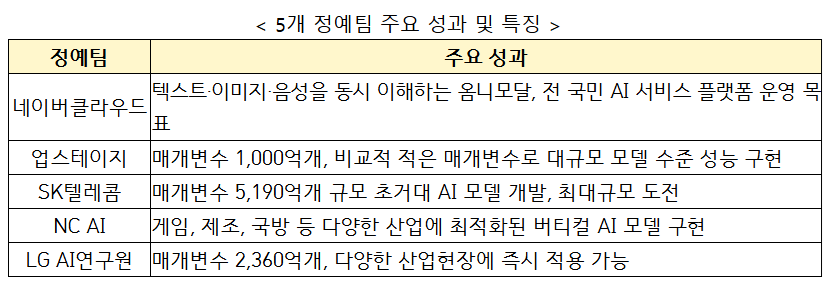 하지만 기술·정책·윤리적 측면 평가에서 중국 큐웬 모델의 인코더·가중치를 사용해 논란이 된 네이버클라우드 정예팀의 AI모델이 독자성 기준을 충족하지 못한 것으로 판단됐다. 과기정통부는 전문가 평가위원들도 독자성 한계에 대한 문제를 제기했다며 이러한 사항을 종합적으로 고려한 결과 네이버클라우드 정예팀은 독자 AI 파운데이션 모델 조건에 부합하지 못하는 것으로 결정했다고 설명했다.