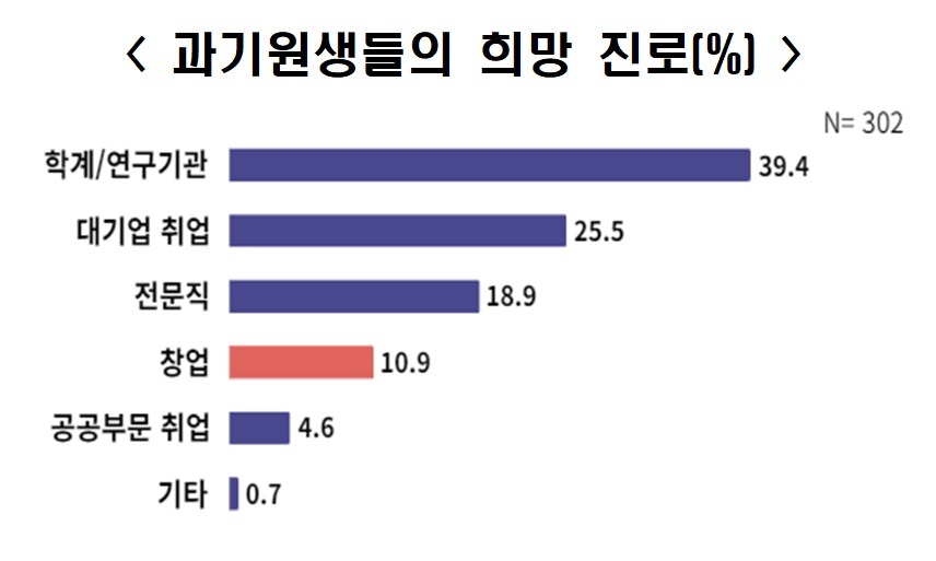 30일 한국경제인협회 기업가정신발전소가 여론조사 전문기관 모노리서치에 의뢰해 실시한 ‘4대 과학기술원 대학(원)생 창업 실태 및 촉진 요인 조사’에 따르면 ‘창업’을 본인의 진로로 선택하겠다는 응답자 비율은 10.9%에 불과했다. 학계 및 연구기관 취업을 희망한다는 비율이 39.4%로 가장 높았고, 다음은 대기업 취업(25.5%), 전문직(18.9%) 순이었다. 이번 조사는 지난해 11월17일부터 이듬달 5일까지 KAIST(한국과학기술원), GIST(광주과학기술원), UNIST(울산과학기술원), DGIST(대구경북과학기술원) 등 4대 과기원생을 대상으로 진행됐고 302명이 응답했다. 한경협 기업가정신발전소는 이에 대해 “과기원생들이 창업의 필요성에는 공감하면서도, 개인의 진로에 있어서는 연구·취업 중심의 안정적 경로를 더 크게 선호하고 있다는 걸 보여준다”고 분석했다.