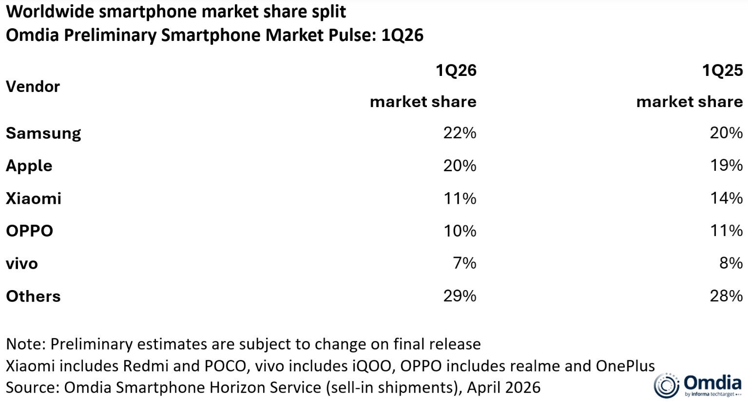 올해 1분기 ‘1위 브랜드’를 놓고서 또 다른 시장조사업체 옴디아의 분석은 달랐다. 삼성전자가 올해 1분기 시장점유율 22%로 1위로 올라섰다. 1년 새 애플의 시장점유율은 20%에서 19%로 소폭 하락하며 2위로 한 계단 내려왔다. 옴디아는 “삼성전자는 플래그십 제품에 대한 견조한 수요와 갤럭시 S26 시리즈의 강력한 사전 주문량에 힘입어 1분기에 1위 자리를 탈환했다”면서 “중급형 제품 출시 지연으로 어려움을 겪었음에도 달성한 성과”라고 치켜세웠다. 이 업체는 이어 “애플 역시 일부 지역의 공급 차질에도 불구하고 아이폰 17 시리즈의 안정적인 가격 책정과 꾸준한 수요에 힘입어 호실적을 기록했다”고 평가했다.