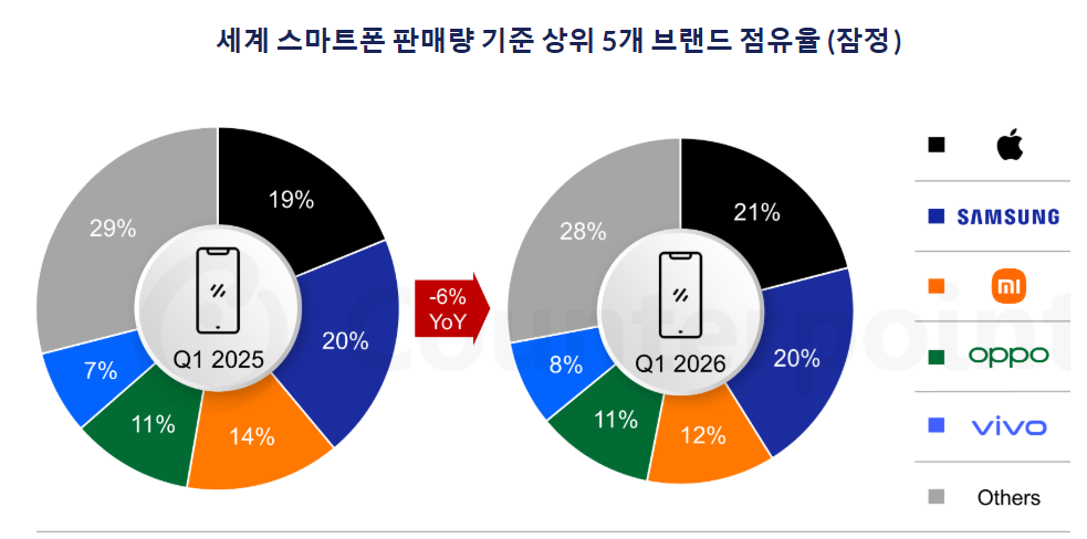 이러한 상황에서도 삼성전자는 시장점유율 20%를 지켜냈다. 카운터포인트는 “갤럭시 S26 시리즈의 초기 인기는 여전히 강세를 보이며 새로운 하드웨어와 통합 AI 기능에 대한 높은 수요를 입증했다. 특히 울트라 모델의 판매량이 가장 높았다”면서 “삼성전자는 비용 상승 압력에 대응하기 위해 제품 포트폴리오를 더욱 조정해 보급형 모델을 간소화하고 고급 사양 모델을 강화함으로써 시작 가격을 실질적으로 인상하는 동시에 프리미엄 제품으로서의 입지를 공고히 했다”고 분석했다. 갤럭시 S26 시리즈 중 최고급 기종인 울트라 1TB(16GB 램) 모델의 출고가는 254만5400원으로 전작 대비 29만 5900원이 인상됐지만, 시리즈 중 판매 비중은 70%를 웃도는 것으로 알려졌다.