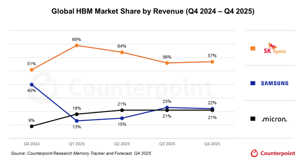 SK하이닉스의 호실적은 ‘공급자 우위’ 시장이 지속하고 있는 상황에서 HBM 등 고부가가치 제품에서의 주도권 확보 등이 복합적으로 영향을 미친 결과다. 시장조사업체 트렌드포스는 올 1분기 중 범용 D램 계약가격 약 90%, 낸드 가격은 약 60% 상승했을 것으로 본다. 자연스레 SK하이닉스의 제품 판매가가 높아지는 구조다. HBM 시장에서도 여전히 높은 시장점유율을 유지 중이다. 시장조사업체 카운터포인트리서치에 따르면 지난해 4분기 기준 SK하이닉스의 시장점유율은 57%로, 삼성전자(22%), 마이크론(21%)에 크게 앞서 있다. SK하이닉스는 “1분기는 계절적 비수기임에도 AI 인프라 투자 확대로 수요 강세가 이어진 가운데, HBM·고용량 서버용 D램 모듈·기업용 솔리드스테이트드라이브(eSSD) 등 고부가가치 제품 판매를 확대하며 실적 상승세를 이어갔다”고 설명했다.