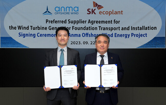 SK에코플랜트는 안마해상풍력㈜가 발주한 ‘안마 해상풍력’ 프로젝트의 ‘해상풍력 운송·설치 사업(Foundations T&I Package)’을 수주하며 우선공급계약(PSA : Preferred Supplier Agreement)을 체결했다고 24일 밝혔다.