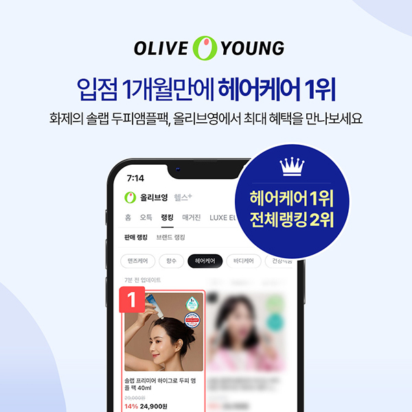 업체에 따르면 1위를 기록한 제품인 ‘프리미어 하이그로 두피앰플팩’은 올리브영 론칭 전부터 자사몰, 네이버, 쿠팡 등 주요 채널에서 인지도를 쌓아왔으며 올리브영 입점 1개월 만에 헤어케어 부문 실시간 랭킹 1위에 오른 솔랩의 베스트셀러 제품이다.