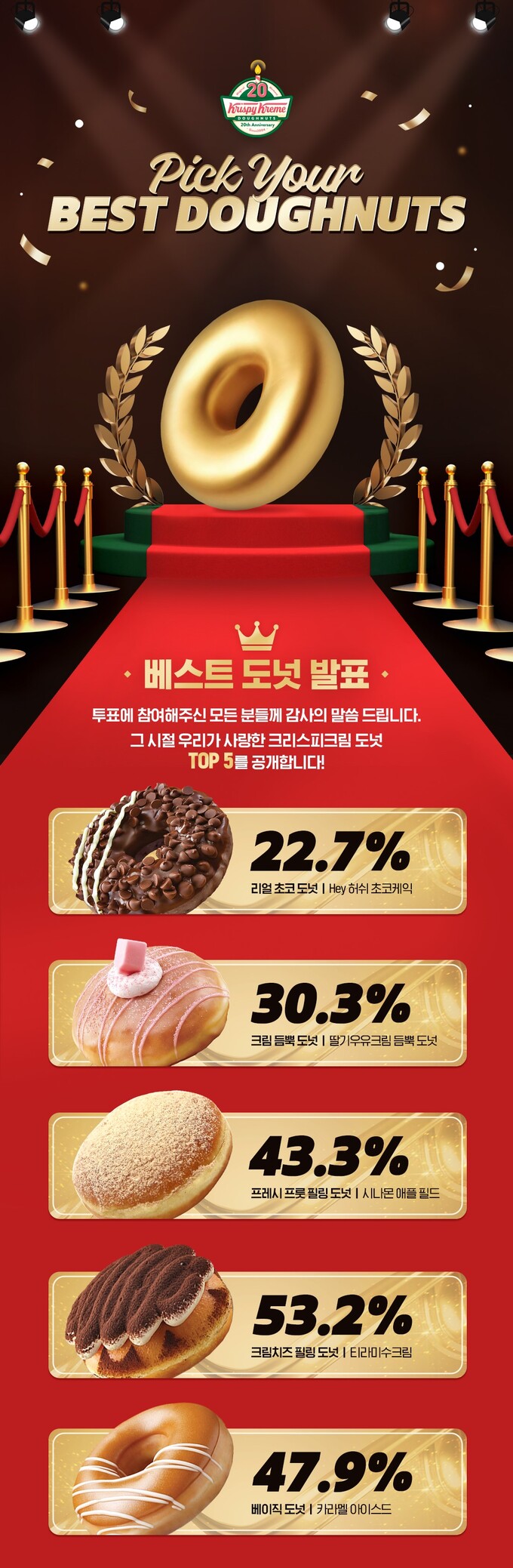 롯데GRS가 운영하는 도넛 프랜차이즈 브랜드 크리스피크림 도넛이 지난 5월말부터 2주간 진행한 한국 진출 20주년 기념 ‘베스트 도넛’ 선발 투표 종료와 함께 각 부문별 베스트 도넛 1위를 발표했다.