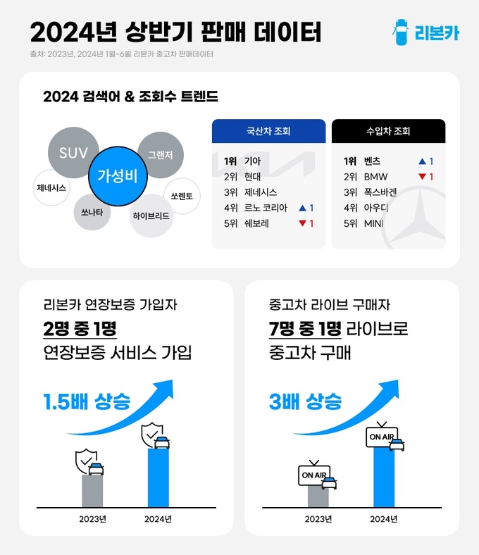 또한, 리본카의 비대면 구매 서비스인 '중고차 라이브커머스' 구매자는 전년 동기 대비 200% 이상 증가하며 소비자의 비대면 상담 선호 현상이 드러났다. 구매 후 180일 동안 품질을 보장하는 ‘리본카 연장보증 서비스’는 서비스 품질을 보다 업그레이드하여 지난해 상반기 대비 가입자가 1.5배 늘었다. 특히, 연장보증 서비스는 지난해 리본카 고객 설문조사 결과 중고차 업체 선택 시 중요도 2순위를 기록할 만큼 구매 후 품질 불안을 해소할 수 있는 중요한 요소로 높게 평가받고 있다.