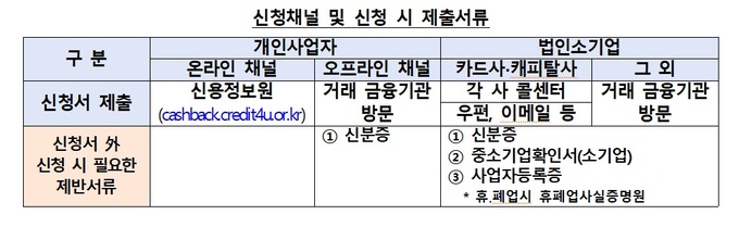 개인사업자인 경우 거래 금융기관을 방문하지 않아도 신용정보원 온라인 신청시스템을 통해 신청할 수 있다. 법인소기업이라면 지원 대상에 해당하는지를 증빙하기 위해 유효기간이 지나지 않은 중소기업확인서(소기업)를 반드시 제출해야 한다. 다만 신청 당시 폐업을 한 경우에는 중소기업확인서 대신 지방중소벤처기업청장이 발급하는 확인 공문을 제출하면 된다.