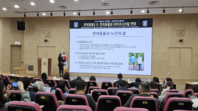 ‘노년기 삶과 반려동물’을 주제로 발표한 김경민 생과대 아동가족학과 교수는 초고령화 사회로의 진입에 맞춰 노인 반려인구에 포커스를 맞췄다. 그는 해외 연구자료를 바탕으로 반려동물을 5년 이상 키운 노인은 그렇지 않은 노인과 비교해 인지기능 감소폭이 완만했다. 또 반려견과의 산책이 건강 유지에 도움이 됐다는 결과도 전하며 현재 해외에서 다양하게 진행 중인 동물기반 중재 프로그램이 국내에도 생겨날 것으로 예상했다.