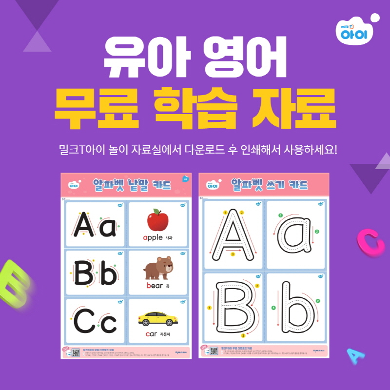 밀크티아이는 공식 홈페이지 ‘놀이 학습 자료실’을 통해 풍성한 학습 자료를 제공 중이다. 그중 영어 놀이 학습 자료는 알파벳 낱말 카드와 알파벳 쓰기 카드가 있다.