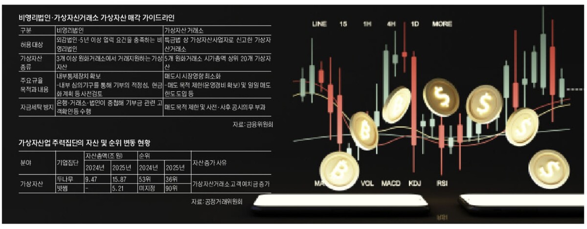가상자산 거래 열풍에 국내 거래소 점유율 1위 업비트를 운영하는 두나무와 2위 빗썸이 나란히 대기업 반열에 올랐다. 다음달부터는 비영리법인 가상자산 매각이 허용되면서 국내 거래소들은 제도 지원을 앞다퉈 내세우며 법인 회원 모집에 나섰다. 가상자산시장이 제도권으로 편입되면서 이들의 영향력도 확대될 것으로 예상된다.