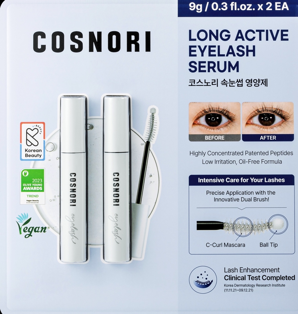 코스노리 관계자는 “해당 제품은 속눈썹 탄력 강화에 효과적인 펩타이드 특허 성분과 보습을 유지하는 히알루론산을 함유했으며, 눈물과 유사한 pH 워터 베이스로 자극 없이 사용할 수 있다. 특수 설계된 C컬형 브러시와 볼팁을 통해 속눈썹 모근까지 꼼꼼하게 영양을 공급할 수 있으며, 속눈썹 개선 효능 평가 시험과 피부 저자극 인체 적용 시험을 완료했다”고 설명했다.