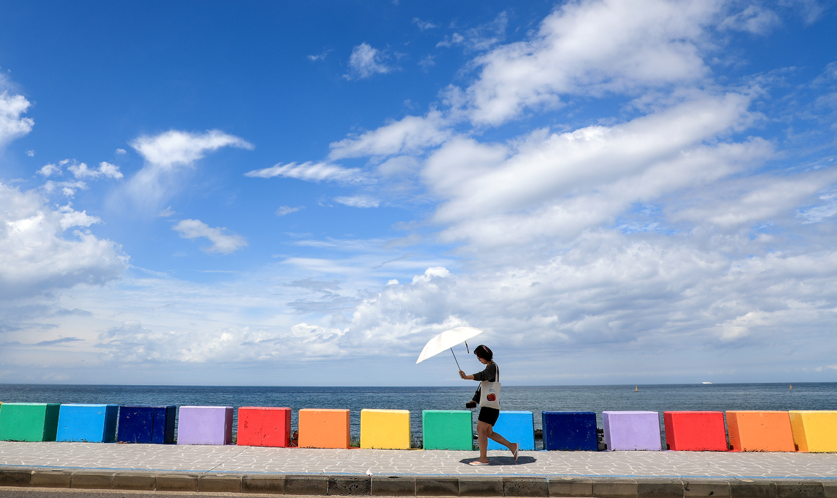 제주시 도두동 무지개 해안도로를 찾은 관광객이 늦더위에 우산을 펼친 채 걸어가고 있다. 뉴시스