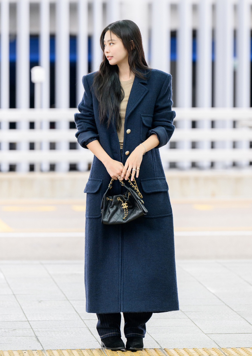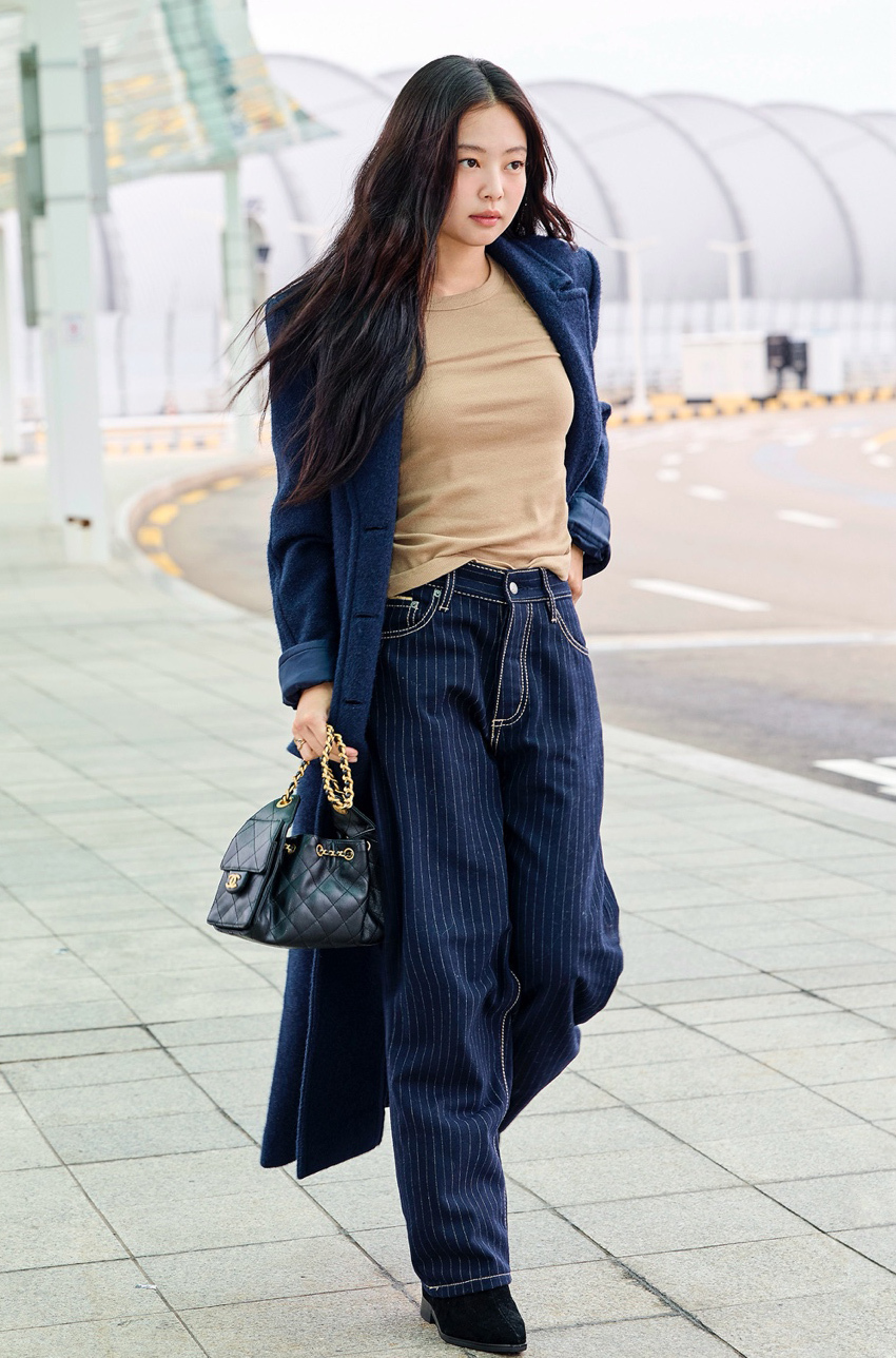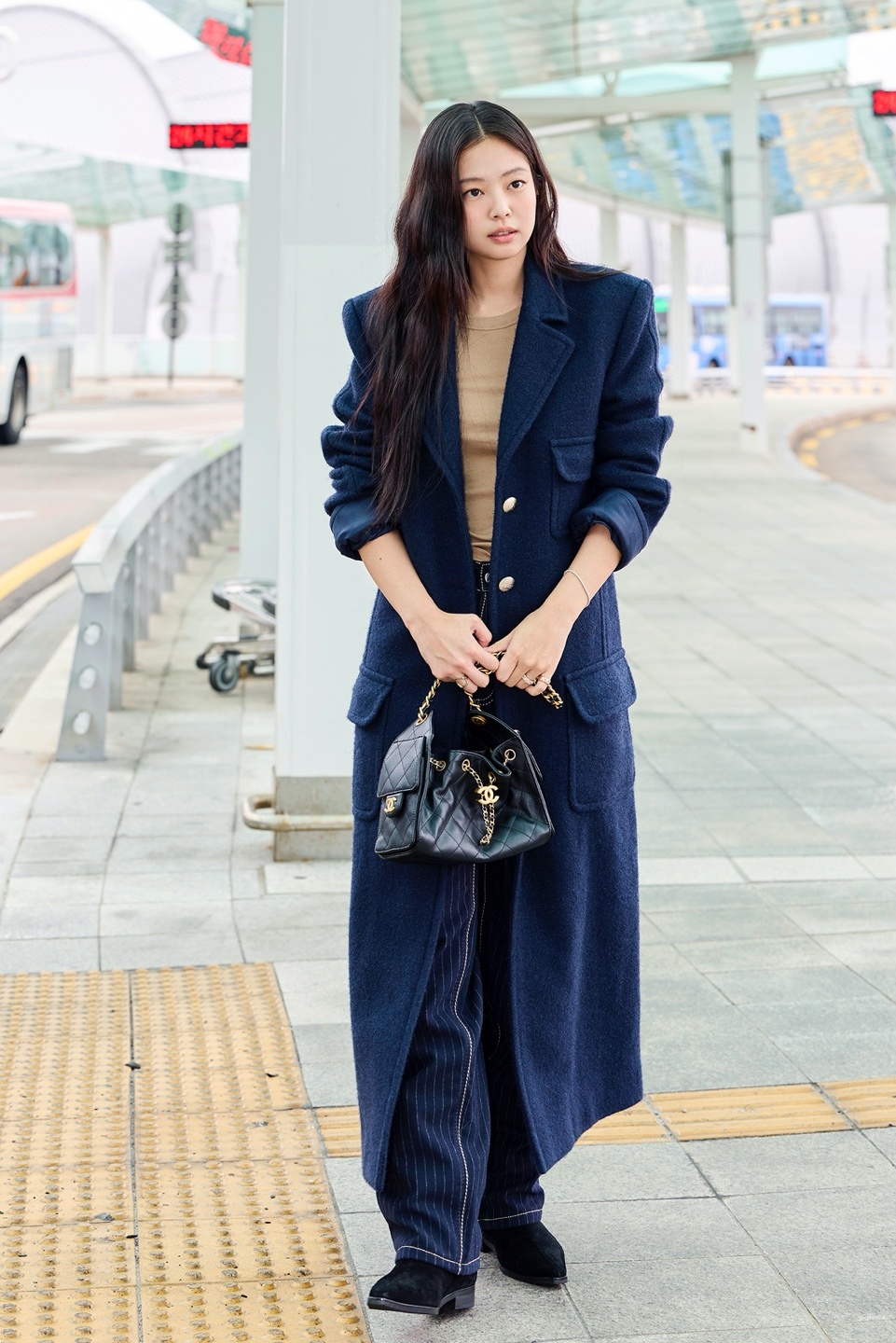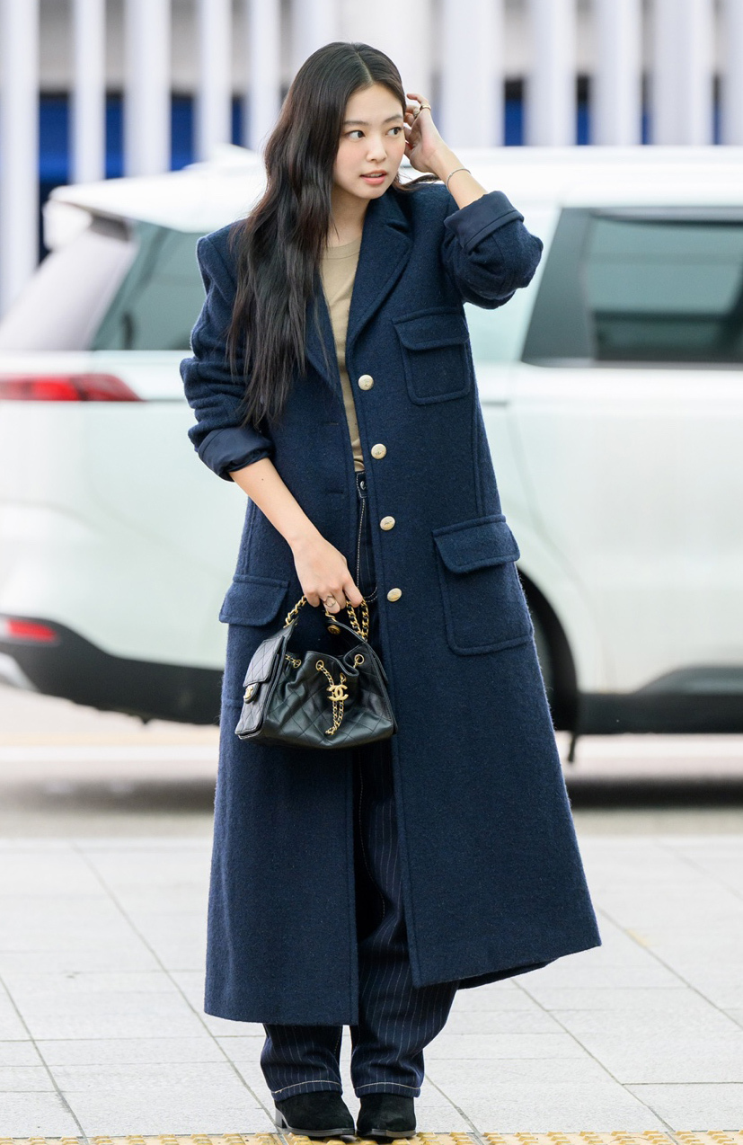 제니는 롱 코트와 미니 핸드백을 착용해 세련미 넘치는 공항패션을 완성했다.