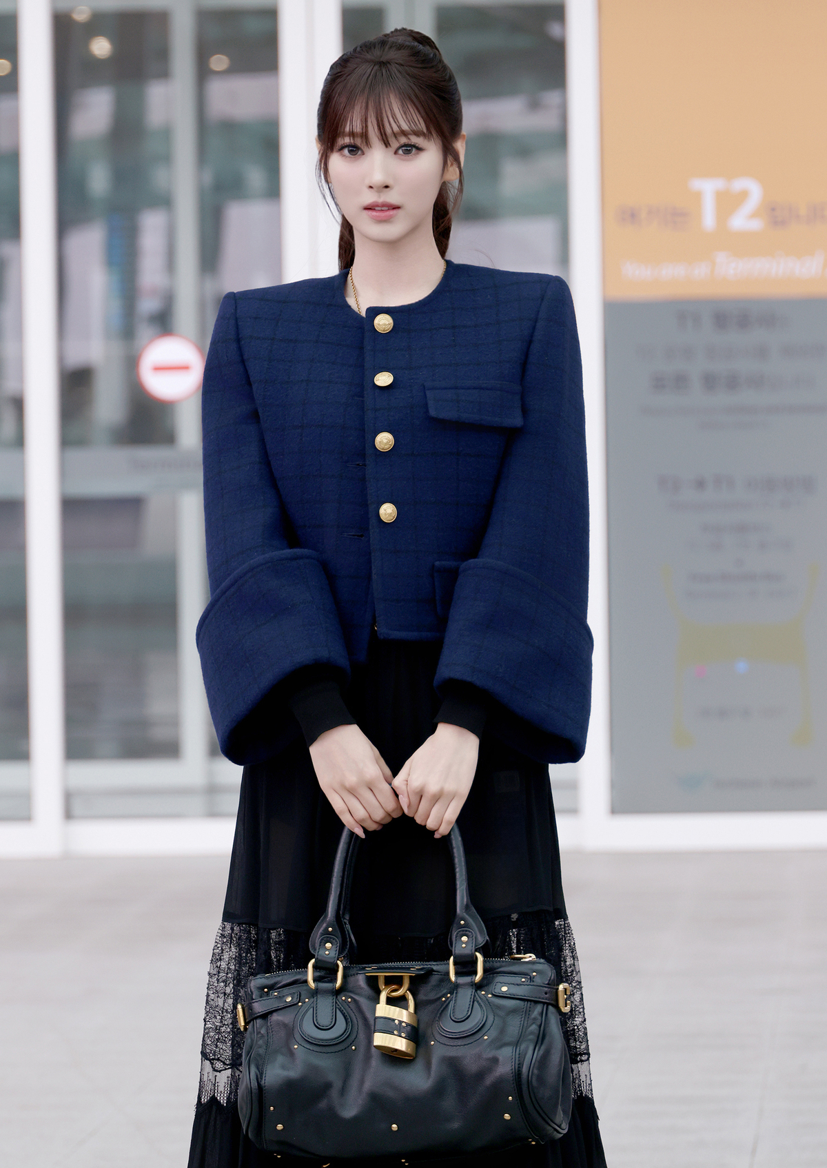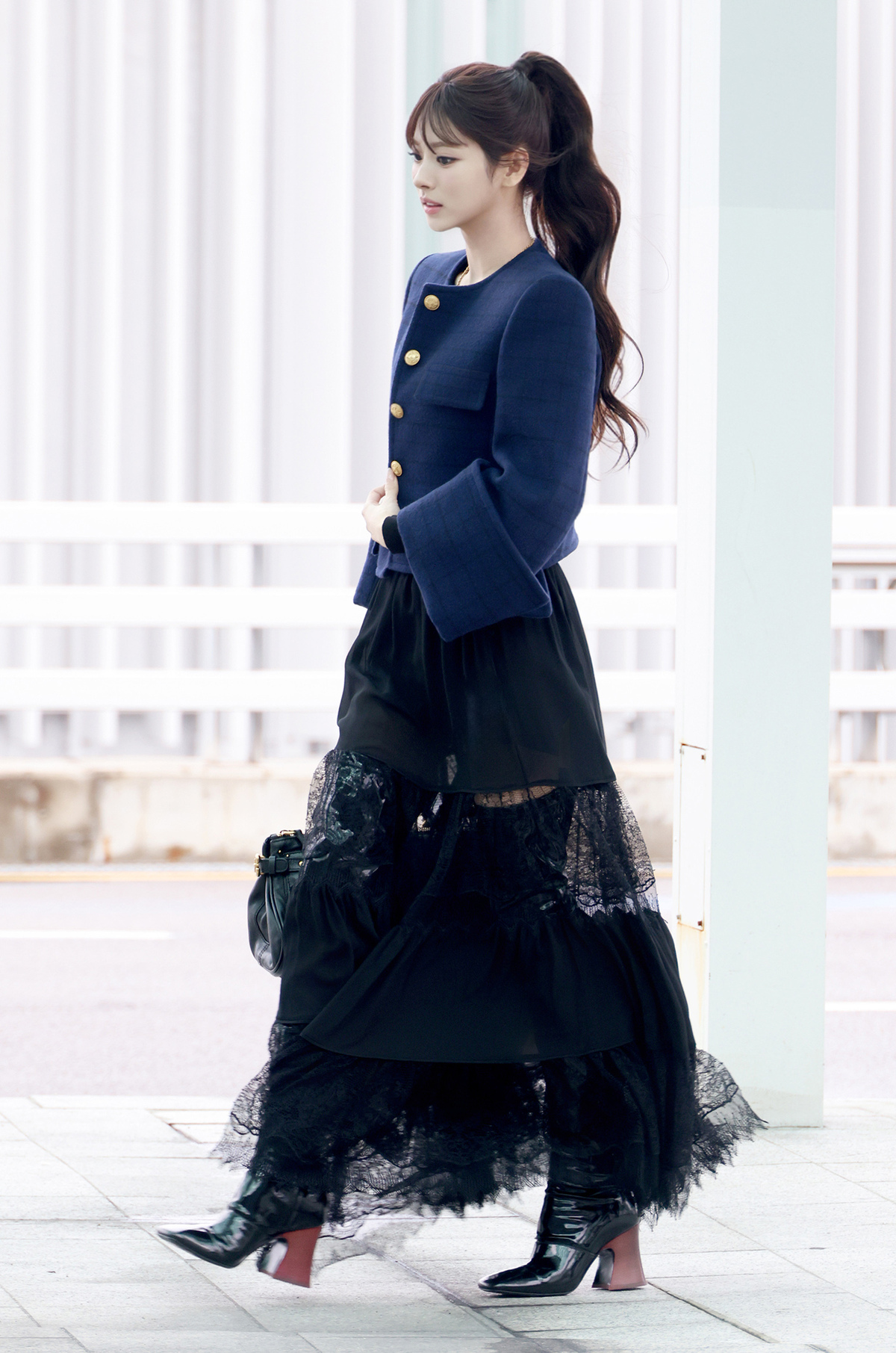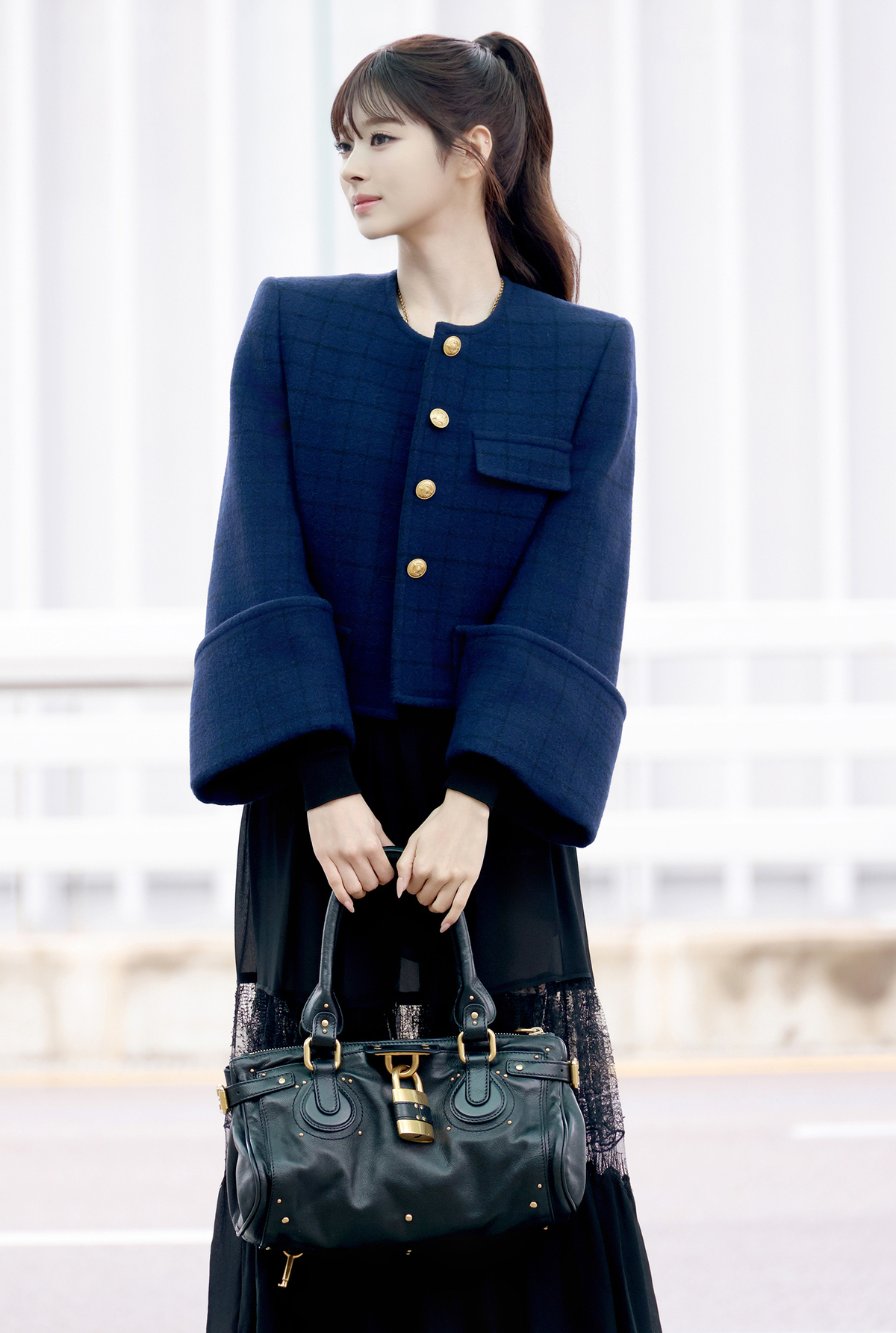 이날 미야오 안나는 인형 같은 비주얼과 독보적인 아우라로 공항을 밝히며 시선을 사로잡았다. 고급스러운 체크 패턴 울 재킷과 페미닌한 실루엣의 레이스 롱 스커트에 태슬 네크리스를 매치해 세련된 무드를 연출하고, 자물쇠 장식이 돋보이는 모던한 블랙 레더 패딩턴 백과 페이턴트 롱 부츠로 감각적인 포인트를 더해 프렌치 시크룩을 완성했다.