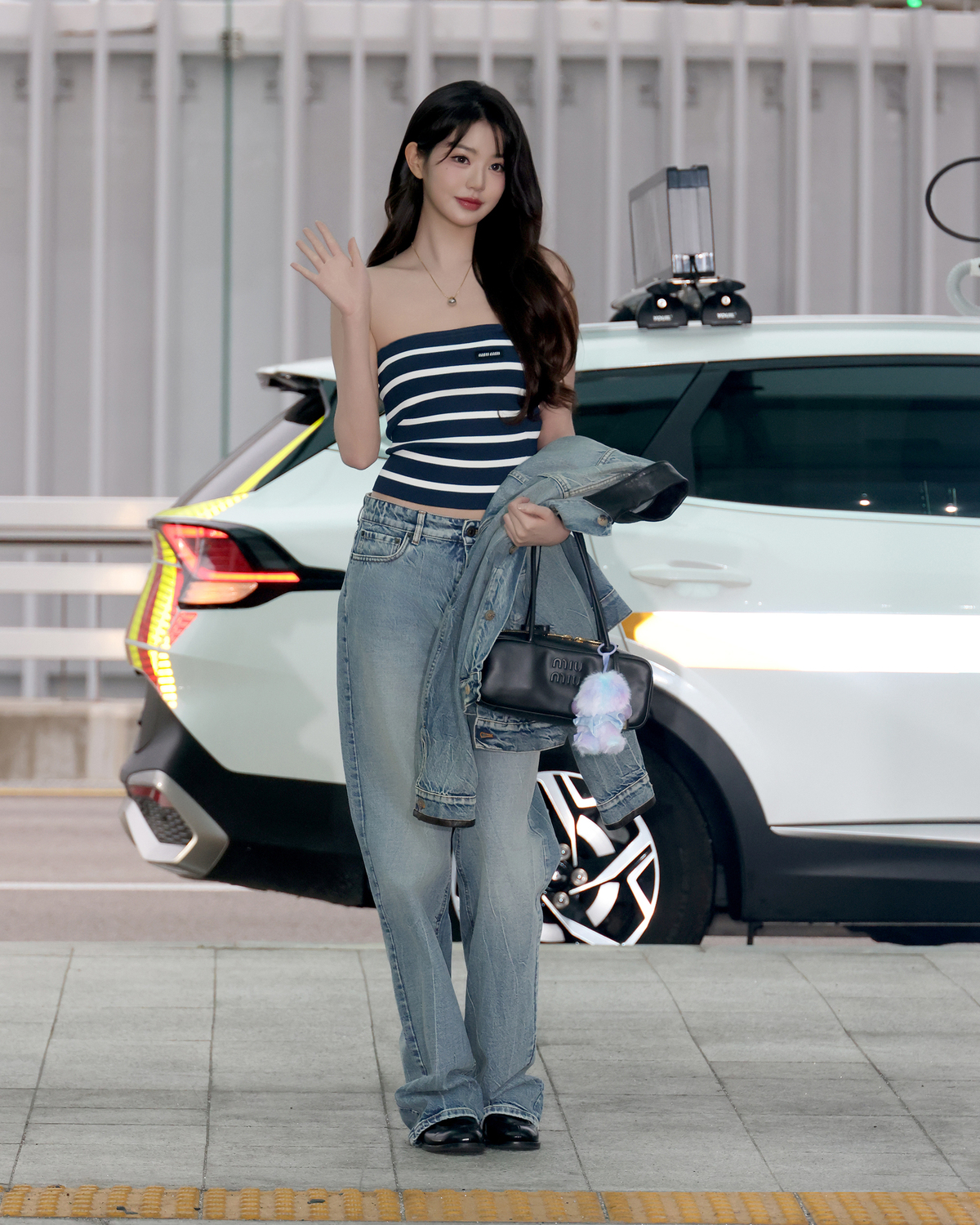 장원영은 스트라이프 튜브 탑에 라이트 블루 컬러의 데님 블루종 재킷과 클래식 핏 데님 팬츠를 착용해 그녀만의 유니크한 셋업 룩을 연출했다.  여기에 브러쉬드 가죽 로퍼와 레트로 무드와 현대적인 감각이 조화를 이루는 가죽 보 백을 매치해 캐주얼한 분위기를 완성했으며, 미우미우 메탈 목걸이로 우아한 느낌을 더해주었다.