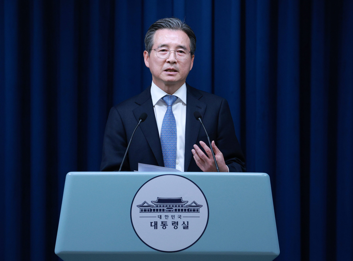 김용범 정책실장이 지난 1일 서울 용산 대통령실 청사에서 샘 알트만 오픈AI CEO 접견 관련 브리핑을 하고 있다. 뉴시스