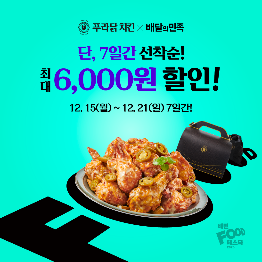 오븐-후라이드 치킨 전문 브랜드 푸라닭 치킨(대표이사 장성식)이 배달의민족에서 진행하는 대규모 할인 프로모션 ‘2025 배민 푸드페스타’에 참여한다고 15일 밝혔다.