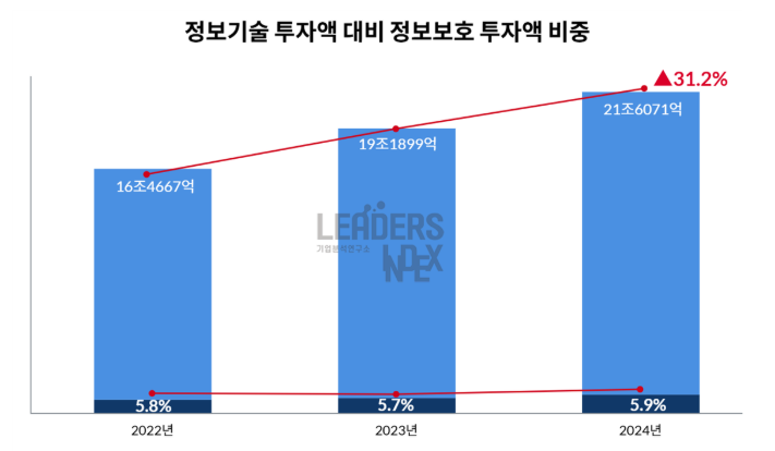 이들 기업의 정보기술 투자액은 2022년 16조4667억에서 2024년 21조6071억원으로 31.2% 증가했다. 같은 기간 정보보호 투자도 9602억원에서 1조2756억원으로 32.8% 늘었다. 하지만 정보기술 투자액 대비 비중으로 보면 5.8%에서 5.9%로 사실상 변화가 없었다. 정보기술 투자 확대 과정에서 정보보호 분야는 상대적으로 후순위에 있었다는 의미다.