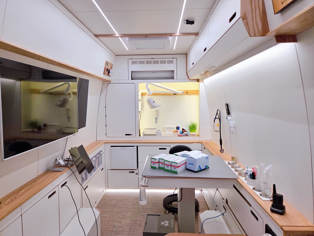 글로벌 운송차량 제조사(이탈리아 IVECO)의 차량을 개조한 이 검진차는 웅장한 외부만큼이나 안락한 내부도 인상적이었다. 스마트 청진기, 초음파 기계, 혈액검사 원심분리기, 검안경, 검이경, 모니터 등 검진을 위한 다양한 전문기기가 마련돼 60~70가지 검사가 가능하다.