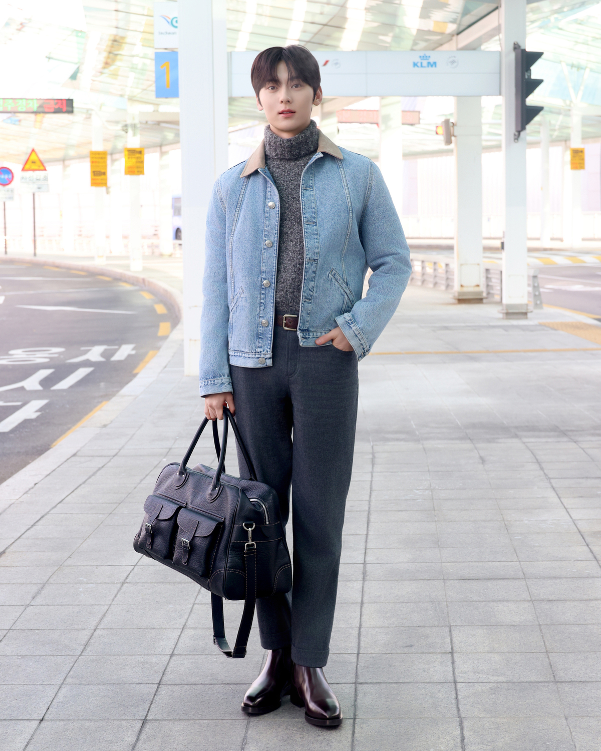 이날 훈훈함 가득한 비주얼로 공항에 등장한 황민현은 스웨이드 카라가 포인트인 연청 데님 재킷에 그레이 컬러의 알파카 울 터틀넥 스웨터를 착용해 부드러운 분위기를 더했으며, 릴랙스드 핏의 울 팬츠로 트렌디하면서도 자연스러운 실루엣을 완성했다.