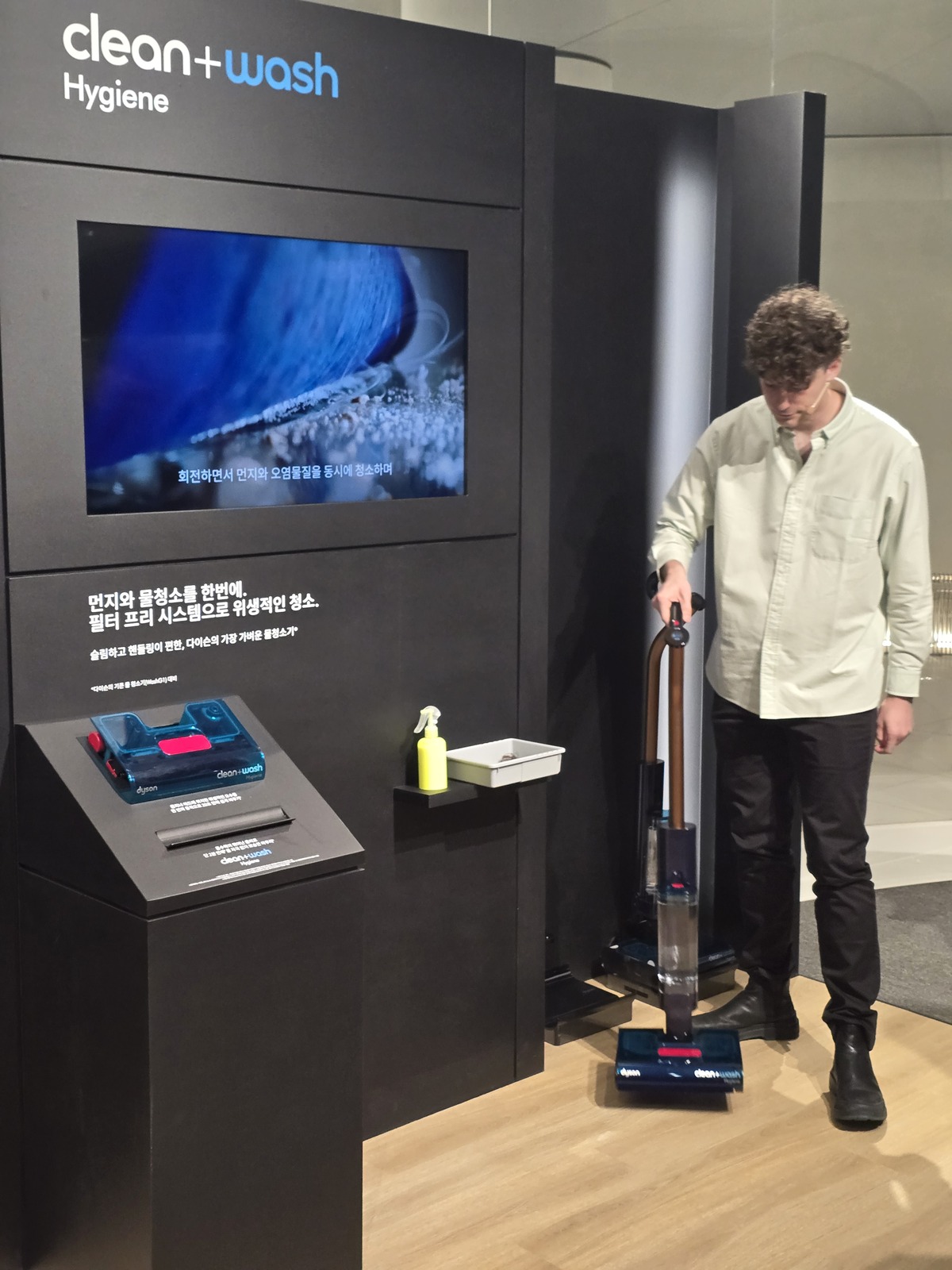 다이슨코리아는 ‘다이슨 클린앤워시 하이진 물청소기’도 선보였다. 먼지와 물청소를 동시에 수행하는 스틱형 물청소기로 필터프리 시스템을 적용해 위생적인 청소를 돕는다. 청소 후엔 오수통과 먼지 트레이를 한 번의 동작으로 간편하게 분리해 위생적으로 오수와 오염물질을 처리할 수 있다.