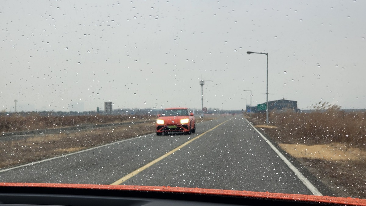 수지에서 화성으로 향하는 구간은 도심과 간선도로의 반복, 속도를 크게 내기 어려운 흐름, 그리고 간헐적으로 열리는 추월 기회가 번갈아 온다. GV60 마그마는 가속 페달을 살짝 건드리는 정도로도 차는 충분히 민첩하게 반응하지만, 그 반응이 불쾌하게 튀거나 신경질적으로 날 서 있진 않았다. “고속 안정성과 민첩한 핸들링, 일상적 편안함을 함께 추구한다”는 제네시스의 설명이, 출발 직후의 일상 주행 감각에서 어느 정도 설득력을 얻는다.